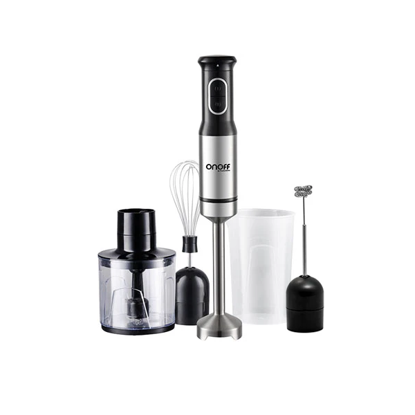 Disfruta de la versatilidad de esta licuadora de inmersión 4 en 1 Onoff. Esta licuadora multifuncional es perfecta para mezclar, triturar y mezclar alimentos. Esta equipada con una bobina de acero inoxidable resistente, una varilla alargada para alcanzar las partes profundas de los utensilios, y un mango ergon—mico para mayor facilidad de uso.