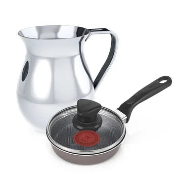 Set práctico para tu cocina. Chocolatera de acero inoxidable resistente y fácil de usar, ideal para calentar y servir líquidos. Sartén antiadherente con tapa de vidrio que permite una cocción uniforme y una limpieza sencilla. Diseño funcional y duradero para el uso diario.