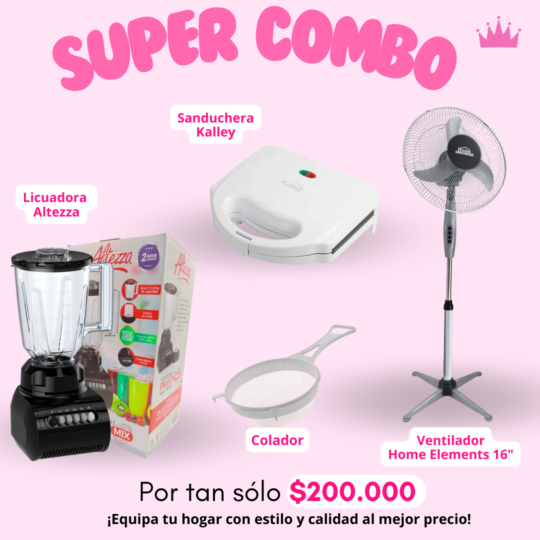 De electrodomésticospsra tu hogar 🏠 que incluye una sanduchera Kalley, una licuadora Altezza, un colador y un ventilador Home Elements de 16", ✨