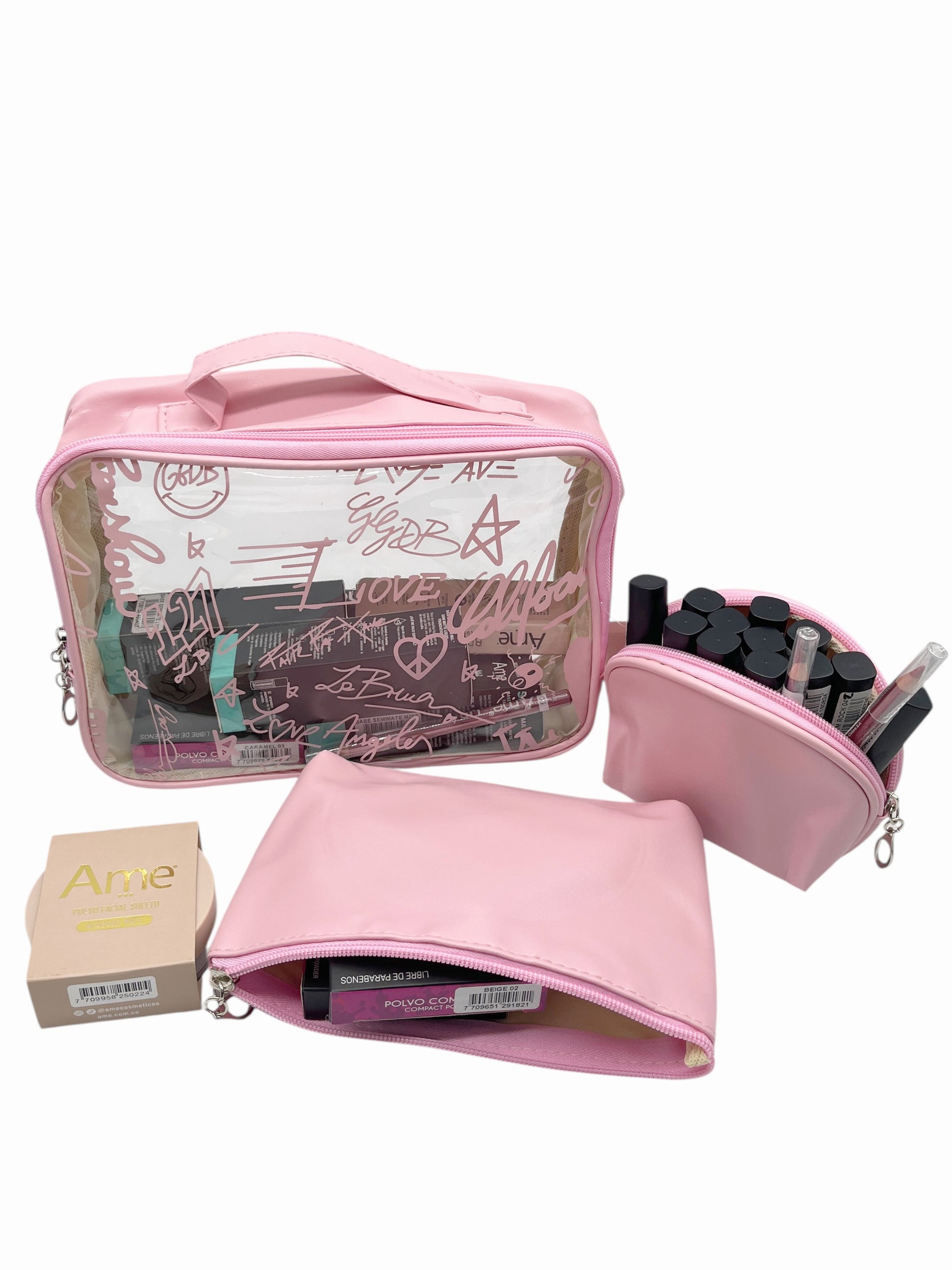 Esta cosmetiquera transparente con detalles en fucsia y gráficos de estilo grafiti es un accesorio diseñado para organizar y transportar productos de maquillaje o cuidado de la piel.