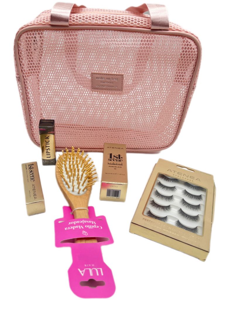 bolsa de maquillaje o neceser de malla de color rosa, diseñada para organizar productos de belleza y cuidado personal. Su diseño de malla transpirable y transparente permite visualizar fácilmente el contenido, lo que la hace ideal para viajes o para el uso diario.