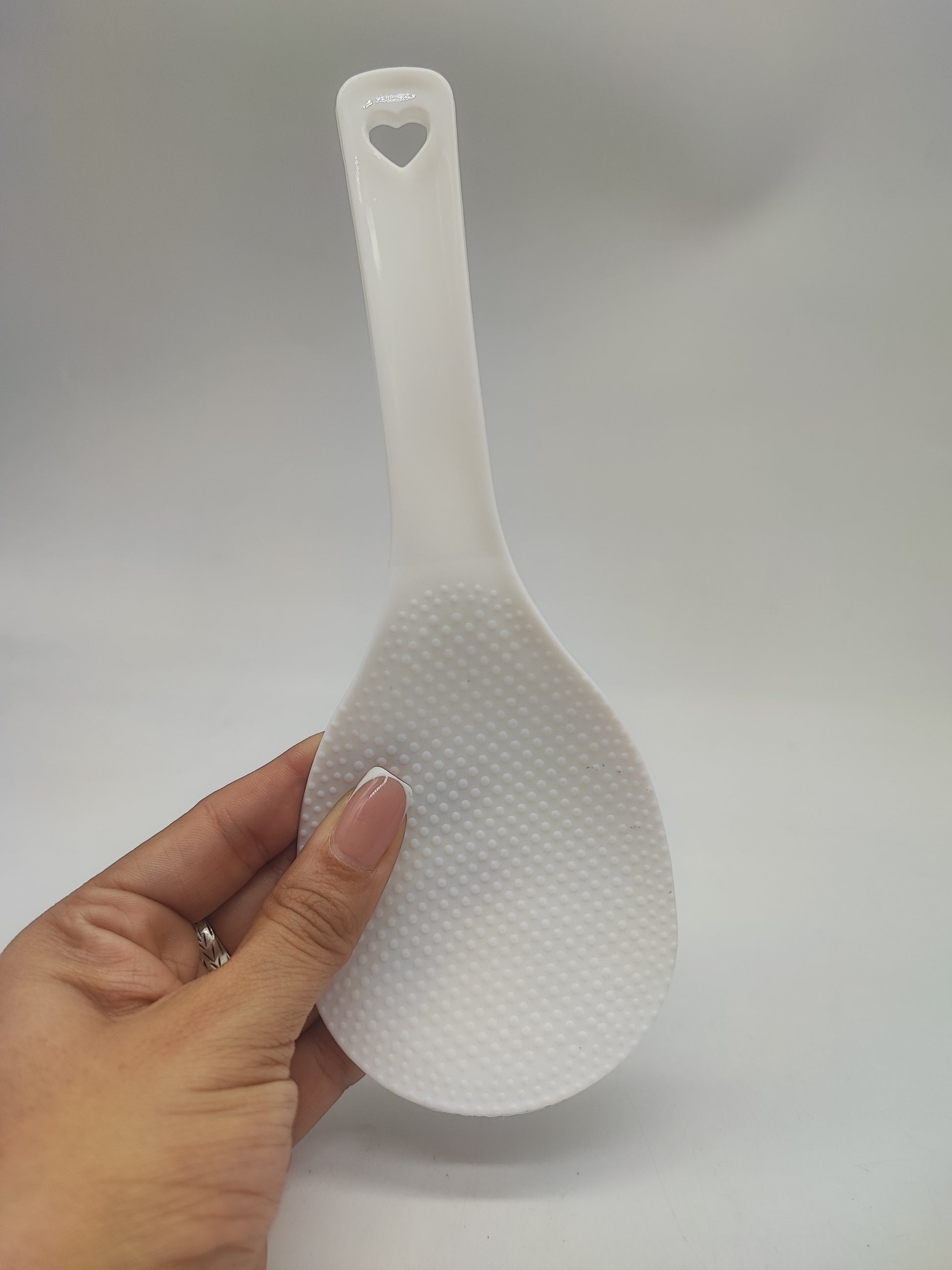 Tiene un mango con un orificio en forma de corazón para colgarla fácilmente.