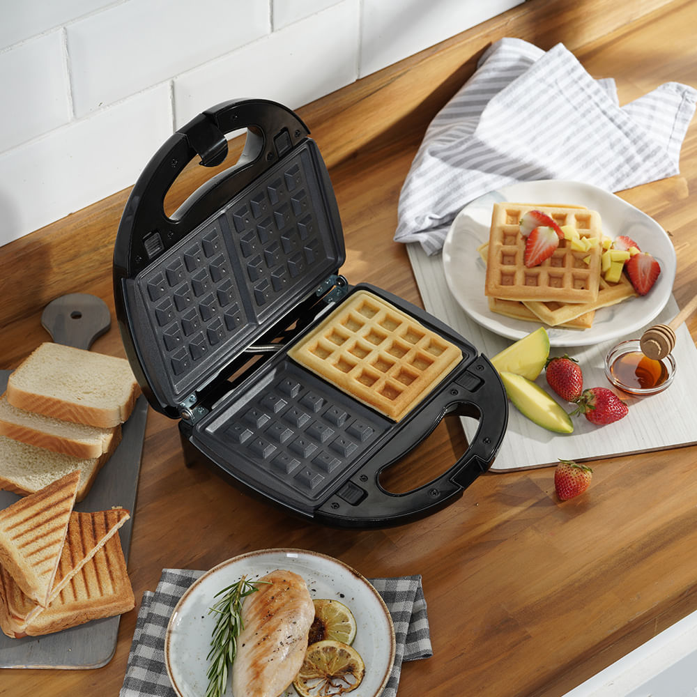 Práctica y versátil sanduchera eléctrica ideal para preparar sándwiches, waffles y alimentos a la parrilla en minutos. Incluye placas intercambiables con recubrimiento antiadherente que facilitan la cocción uniforme y la limpieza. Su diseño compacto con asa de tacto frío y sistema de cierre seguro la hace perfecta para el uso diario en casa.