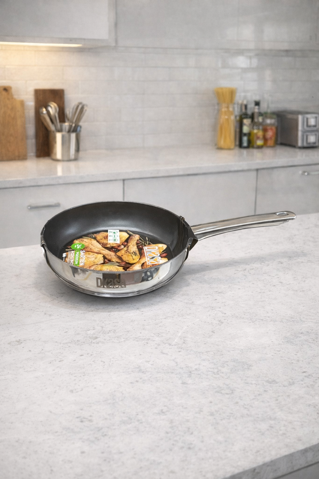 Sartén de acero inoxidable con recubrimiento antiadherente, ideal para cocinar de forma uniforme y sin que los alimentos se peguen. Cuenta con mango ergonómico resistente al calor, diseño moderno y fácil limpieza. Perfecta para el uso diario en cualquier cocina.